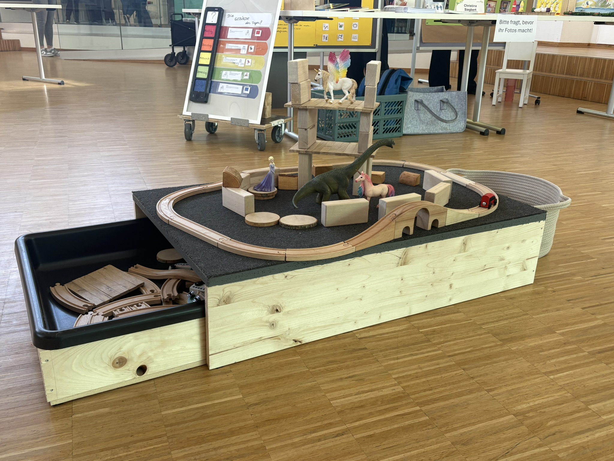 Ein zentraler Bestandteil der Fortbildung war die praktische Umsetzung: Jede Teilnehmerin entwickelte und realisierte ein Projekt aus den Themen der Fortbildung in der jeweiligen Einrichtung. Die Projekte wurden anschließend in einer kurzen Abschlussarbeit reflektiert und im Rahmen eines öffentlichen „Markts der Möglichkeiten“ im Ludwig- Windthorst- Haus präsentiert. Dabei zeigte sich die Vielfalt und Qualität der Arbeit eindrucksvoll. Thematisch reichten die Projekte von ästhetischer Bildung, Bewegung über Wahrnehmung, Schlafen und Ruhen bis hin zu Gebärden. Optisch ansprechend und überaus informativ wurden sie beim Markt der Möglichkeiten an Ständen präsentiert.